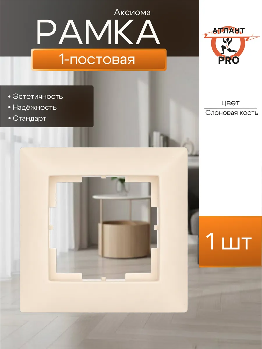 Описание товара: "Аксиома" Рамка одноместная для розетки / выключателя МРФИ11.14.00.00 "слоновая кость" Преимущества товара: Качественный материал: Рамка изготовлена из высококачественного ABS пластика, который отличается прочностью и долговечностью. Цвет рамки "Слоновая кость" придает интерьеру элегантность и стиль. Товар изготовлен в России, что подтверждает его надежность и качество. Покупайте "Аксиому" от "КУНЦЕВО-ЭЛЕКТРО" и получите комфорт, простота установки и использование благодаря вертикальному и горизонтальному монтажу. Долговечность: Благодаря качественному материалу и производству в России, рамка прослужит вам долго. Не упустите возможность обновить свой дом или офис с помощью современной и надежной рамки от известного бренда "КУНЦЕВО-ЭЛЕКТРО". Заказывайте прямо сейчас!