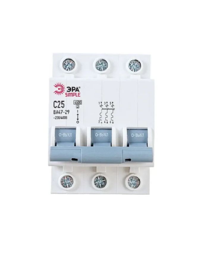 Автоматический выключатель ЭРА SIMPLE SIMPLE-mod-23 ВА 47-29 3P 25А кривая С 4,5кА Б0039240 3х полюсный предназначен для применения в электрических цепях напряжением до 400 В переменного тока частоты 50 Гц, их защиты при перегрузках и коротких замыканиях, проведения тока в нормальном режиме и не частых оперативных включений и отключений указанных цепей. Автоматические выключатели - это устройства, которые играют важную роль в обеспечении электробезопасности в домах, офисах, промышленных сооружениях и других местах. Они предназначены для защиты электрических сетей от перегрузок и коротких замыканий, а также для предотвращения пожаров и повреждений электрооборудования. Основные характеристики: Мониторят токовую нагрузку на электрической линии. В случае превышения допустимого предела они обрывают цепь, предотвращая потенциальные повреждения оборудования..Когда происходит короткое замыкание, автомат моментально обрывает цепь, предотвращая возможные пожары и повреждения проводки..Повышенная безопасность: Они оснащены механизмами, которые предотвращают случайное включение или отключение, обеспечивая дополнительный уровень безопасности..Легко устанавливаются и обслуживаются, что делает их идеальным выбором для домашних хозяйств и профессиональных электриков. Это необходимый элемент любой электрической системы, который обеспечивает защиту от перегрузок, коротких замыканий и других опасных ситуаций. Их использование способствует повышению электробезопасности и снижению риска возникновения пожаров.