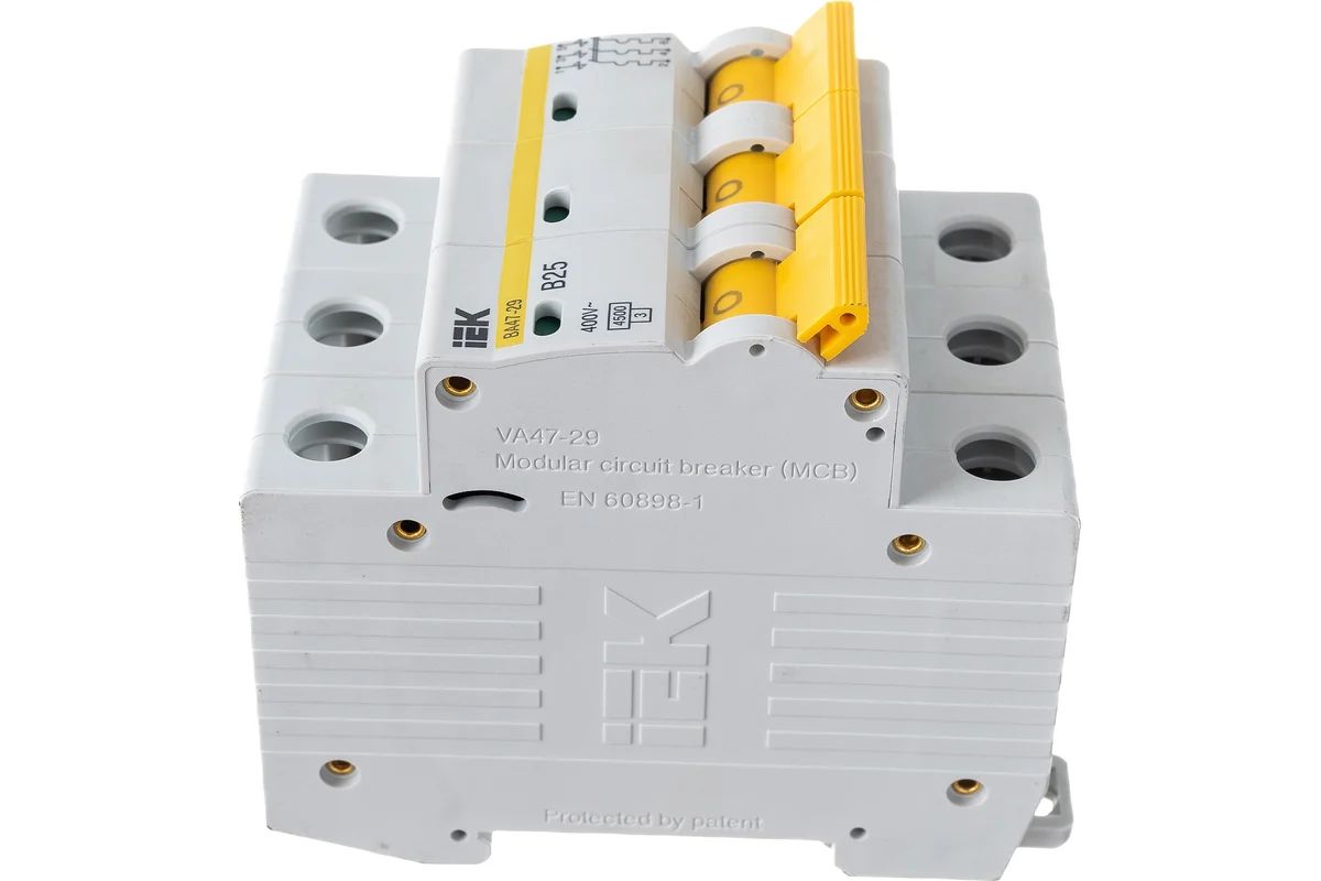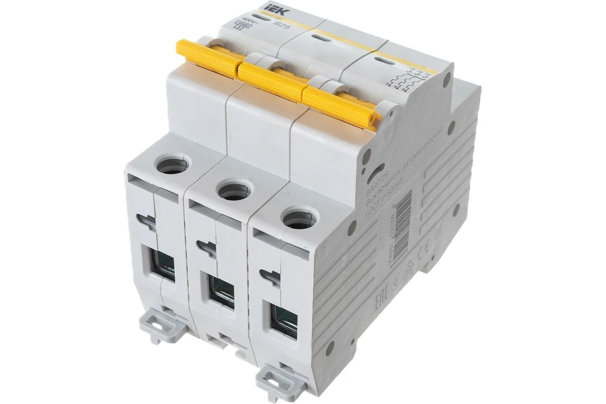 Автоматический 3-полюсный выключатель KARAT Автоматический выключатель ВА47-29 3P C 25А 4,5кА IEK применяется для защиты от перегрузок и коротких замыканий в электрических цепях с групповыми или единичными потребителями энергии. Монтируется в жилых или офисных помещениях в горизонтальном и вертикальном положениях. Корпус изготовлен из пластика, а подвижные контакты переключателя снабжены серебросодержащей напайкой, что делает конструкцию надежной и долговечной. Тип характеристики срабатывания - В, позволяет применять выключатель с бытовыми цепями, выполненными алюминиевыми проводами. Нагрузку можно подключать к верхним или нижним зажимам. Применение этого выключателя особенно актуально в современных электрических системах, где важна безопасность и эффективность работы. Его конструкция позволяет легко интегрировать прибор в распределительные щиты, а модульный формат обеспечивает удобство установки и обслуживания. Устройство обладает устойчивостью к коротким замыканиям, что подтверждается номинальной характеристикой отсечения. Долгий срок службы;-Защита от перегрузок и замыканий;- переключателя;-Усовершенствованная более широкая рукоятка выключателя с увеличенной площадью контакта облегчает процесс коммутации;-Насечки на контактных зажимах снижают тепловые потери и увеличивают механическую устойчивость соединения;-Характеристика срабатывания - С. Данный автоматический выключатель имеет высокую крутящую способность, что делает его надежным решением для защиты электрических сетей. Он построен с учетом современных стандартов и технологий, что гарантирует его долговечность и стабильную работу под нагрузкой. С данным оборудованием вы сможете быть уверены в безопасности своих электроустановок. Пользуйтесь современными решениями в области электроустановочных изделий и обеспечьте надежность своих электрических цепей с помощью этого автоматического выключателя. Он станет незаменимым атрибутом для каждого, кто заботится о защите своего электроснабжения и хочет избежать нежелательных последствий. Этот выключатель также подойдет для использования в различных промышленных условиях, гарантируя надежность и производительность в любом проекте.